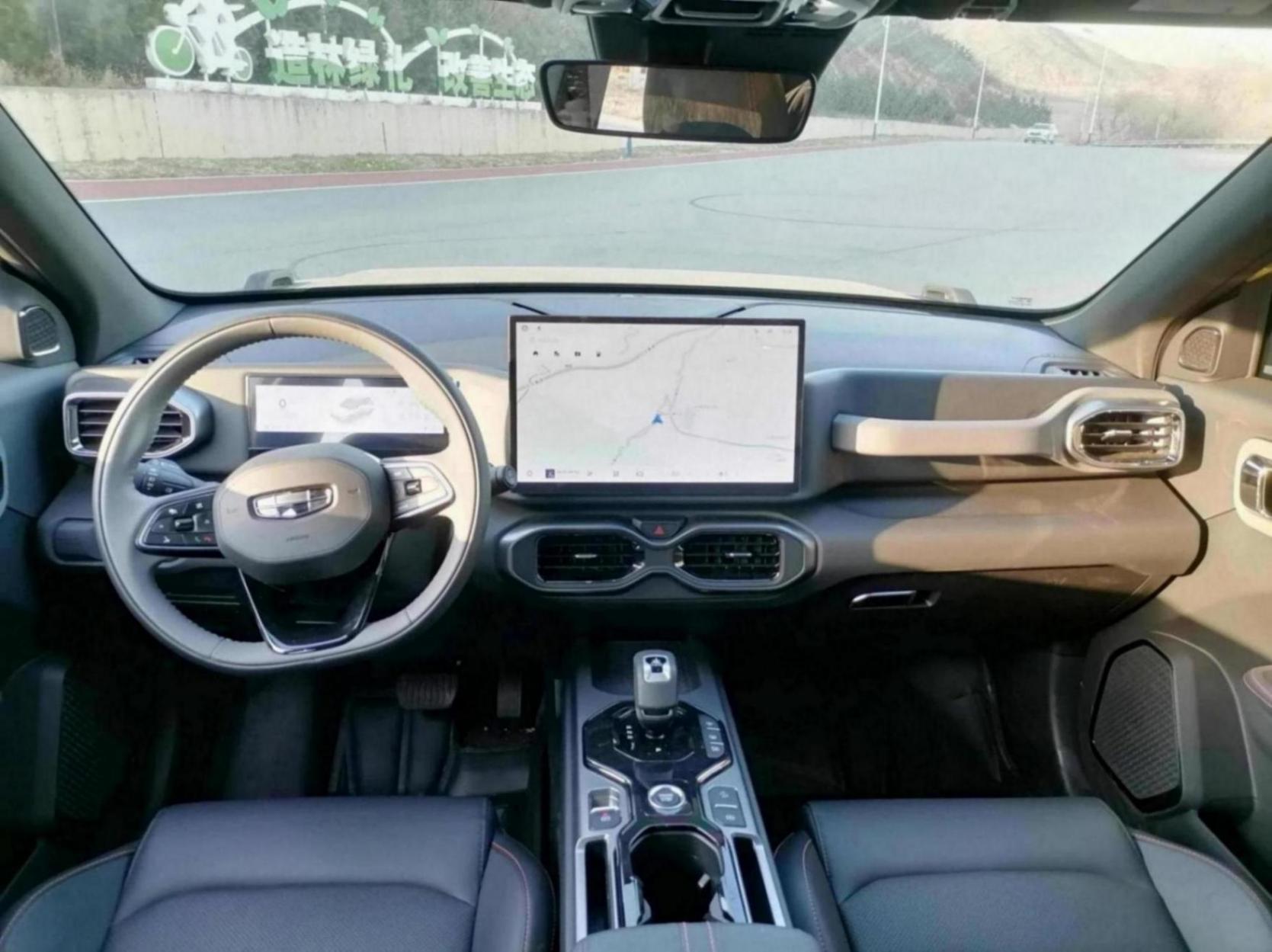 打開車門,吉利牛仔的內飾設計同樣令人眼前一亮,整體布局簡潔而不失豪華,吉利牛仔內飾風格將科技感與越野元素完美融合,仙蹤綠和礦野灰兩款主題色帶來獨特視覺享受。8.8英寸液晶儀表屏與14.6英寸中控顯示屏,搭配Flyme Auto車機系統與8核CPU的E02高性能座艙芯片,智能交互體驗流暢便捷,桌面超級自定義功能讓車主隨心打造專屬駕駛空間。