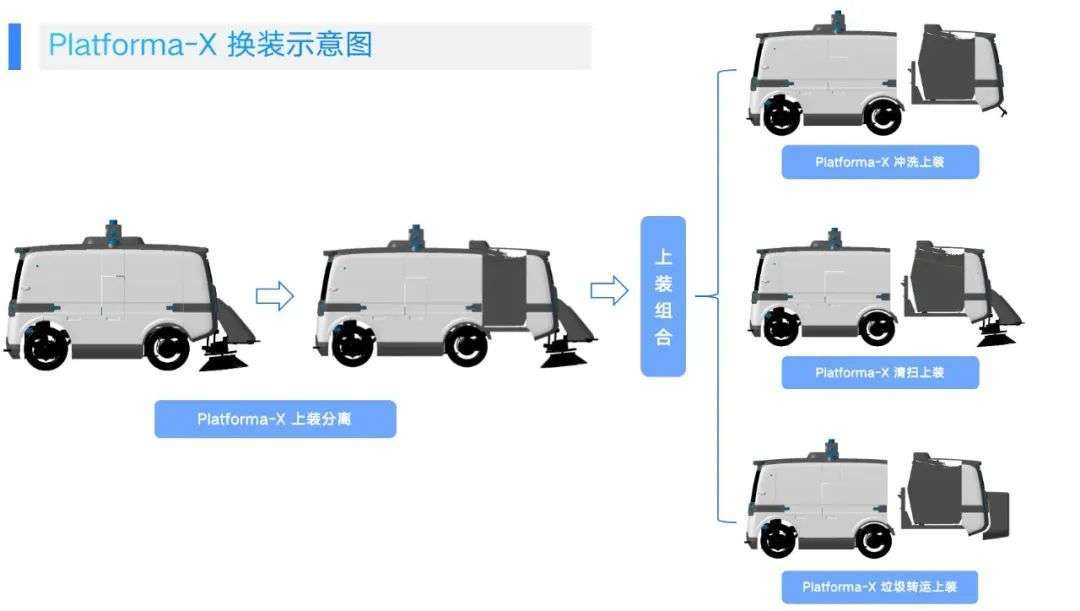 以仙途智能今年3月上新的Platforma-X無人駕駛環衛裝備為例,其采用“1個底盤+3個上裝”,像搭積木一樣實現了清掃、沖洗、垃圾清運三種模式的靈活變裝。也就是說,運營方不需要單獨采購不同的環衛車型,節約50%的購車成本。不僅如此,Platforma-X采用無駕駛室設計,它可以自主完成啟動自檢、定時作業、傾倒垃圾、自動充電、自動加水等任務,讓司機和充電加水的人工成本降低至0。綜合來算,Platforma-X“一車多用”可將環衛作業成本降低近70%,真正做到“省錢”的狀態。