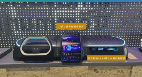 京東方推出的車載級17英寸曲率漸變中控屏和15.05英寸水滴型折疊副屏,融合了前沿的柔性顯示和結構設計。水滴型折疊副屏采用業內領先的內折水滴型轉軸技術,折疊半徑僅為R3,并配備滑移補償模塊,可在折疊過程中動態補償屏幕彎折區弧長。這種設計大幅提升了屏幕的耐用性,同時實現了副屏的靈活收納,為主副駕的獨立使用提供了可能。