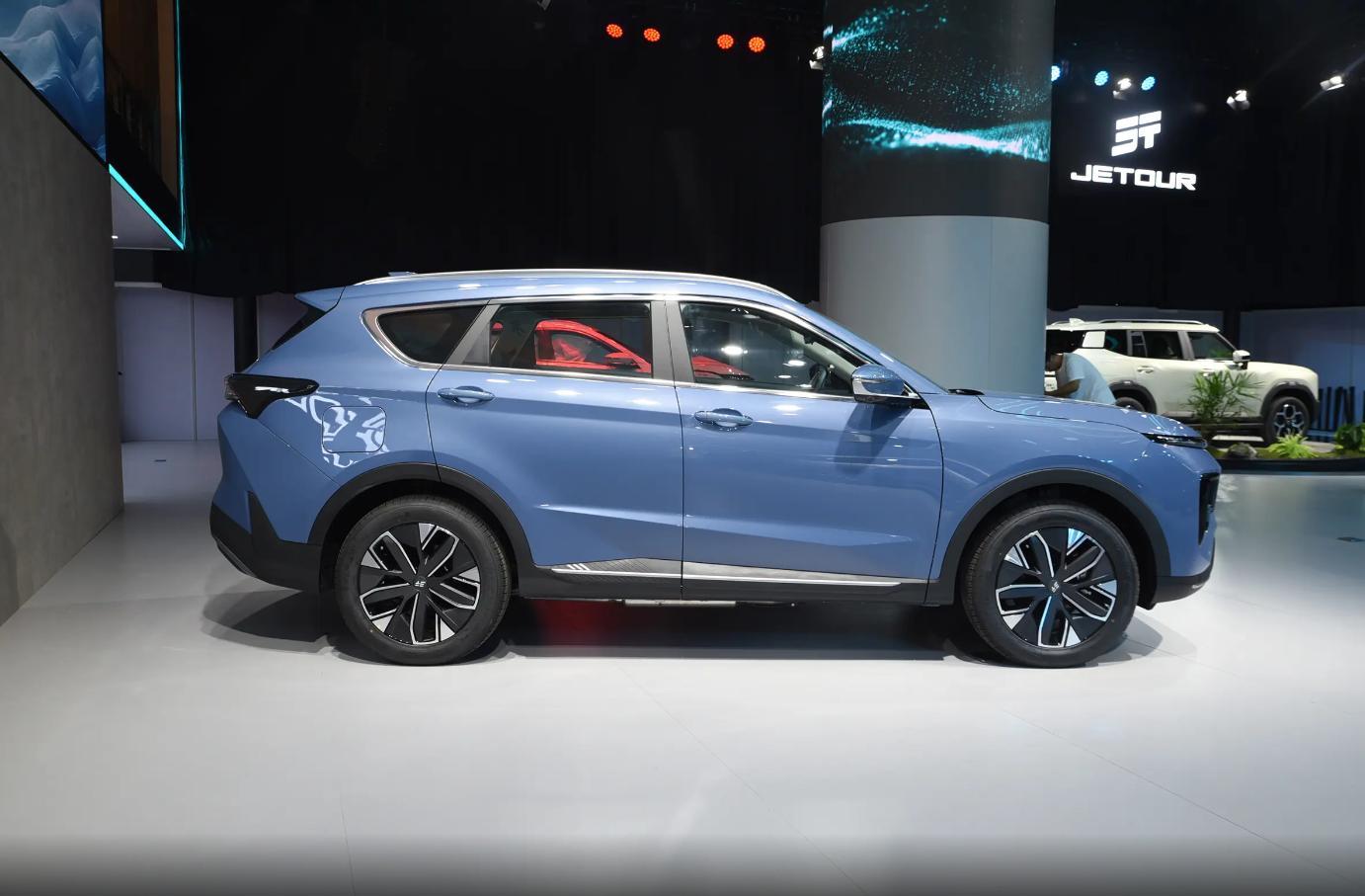 當然車身側面和尾部就差異比較大了,車身側面能明顯感覺到一些熟悉的影子,這款插電混動車型明顯繼承了之前捷途X系列的主體白車身設計元素,還是典型的前傾腰線,而且并沒有采用隱藏門把手,當然尾部也是之前捷途X系列比較經典的貫穿燈光效果。
