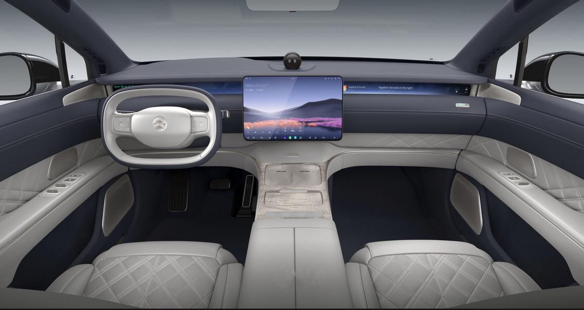 ET9的內飾加入了Skyline天際線屏幕,在主/副駕兩側均可以顯示車輛信息。中央配備15.6英寸AMOLED懸浮式中控屏,內置SkyOS·天樞整車全域操作系統,涵蓋車控、智駕、座艙、移動互聯等多個領域。
