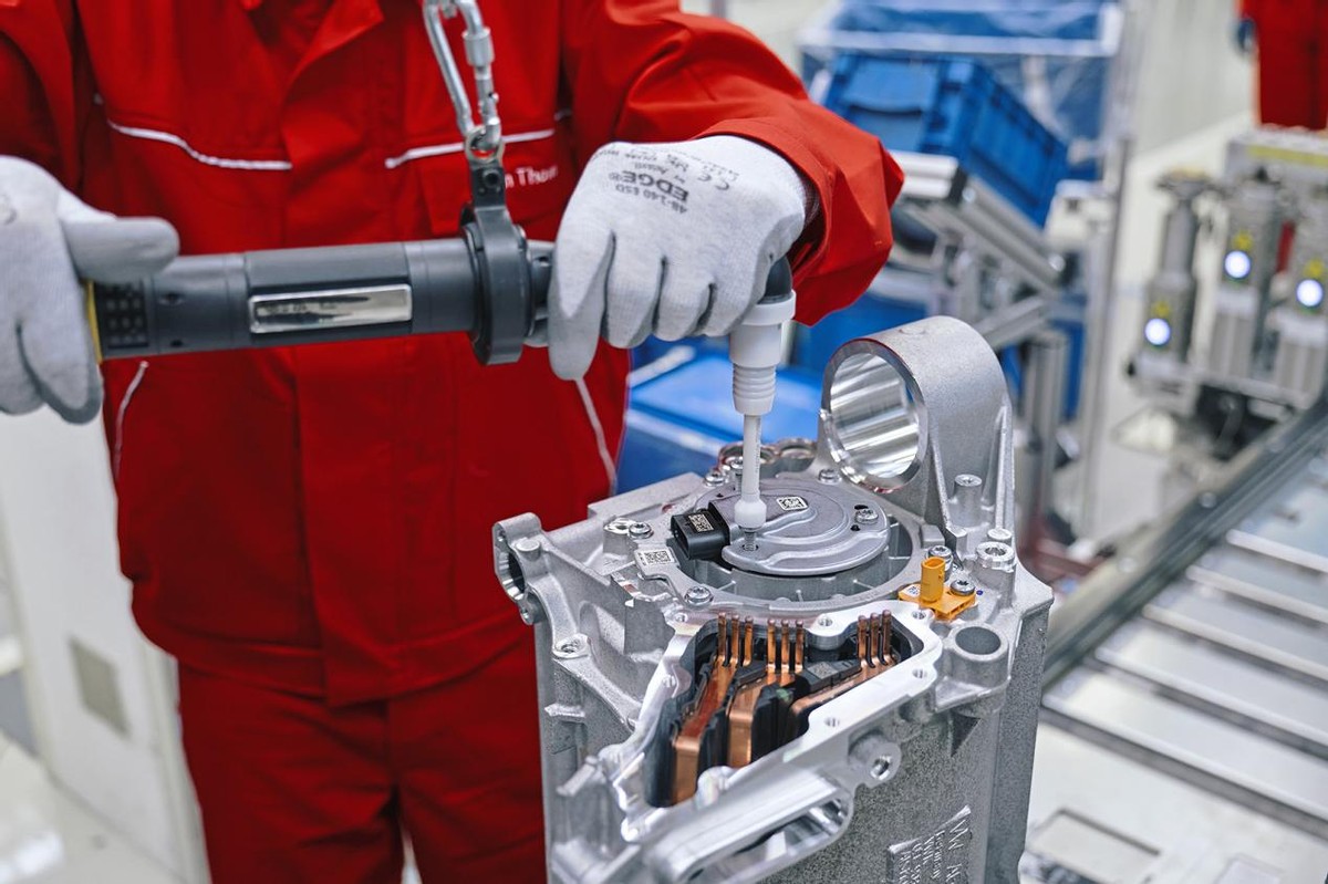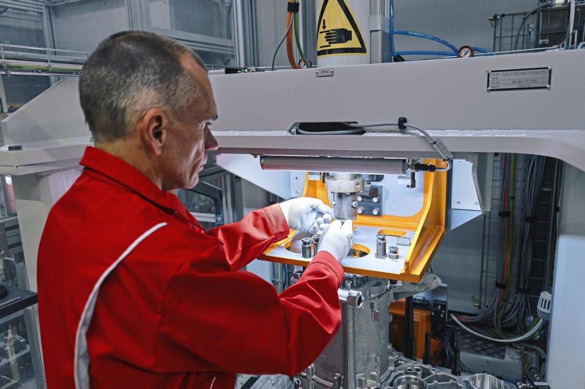 在之前參觀大眾汽車工廠時,我已經熟悉電動EC扳手的操作,但帶有綠色和紅色LED顯示屏的機械扳手對我來說還是全新的。盡管如此,擰緊螺絲的工作還是非常順利的,就像是安裝轉子位置傳感器的金屬蓋一樣。這個蓋子可以保護永磁同步電動機轉子軸末端的塑料蓋。在這里,每臺電動機及其變速箱的精確性是如此重要,包括對電動機的牽引力和動力進行最終測試,以及檢查駐車鎖、所有執行器和油泵的功能。畢竟,在因戈爾施塔特,質量應該得到100%的保證。