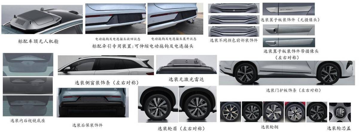 根據(jù)申報信息,唐L提供了豐富的選裝,車頂激光雷達、前向三目攝像頭、翼子板裝飾(關(guān)聯(lián)側(cè)向攝像頭)、輪轂、車頂無人機艙以及車尾電動拖車鉤+電動連接頭等。其中,車頂無人機艙為DM-p版本和純電四驅(qū)版本的選裝配置;而激光雷達則在純電車型上屬于標準配置,在插混車型上屬于選配,有望使用高規(guī)格的“天神之眼”高階智駕系統(tǒng)。