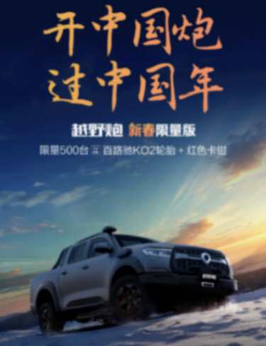 首頁 > 奧迪 > 限量500臺:9.9元下訂享好禮,長城越野炮車型推新春限量版