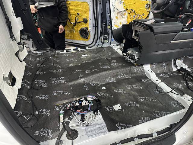 經過檢測,技師發現原車的噪聲主要有兩種,第一種是汽車自身產生的低頻共振,第二種是外界傳入的風噪。因此技師使用大白鯊系列隔音材料,對汽車的底盤和四門,做了針對性的隔音處理。