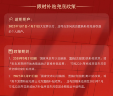 1月4日,東風奕派官方宣布推出“補貼兜底”政策,東風奕派承諾,在2025年1月1日至1月31日期間大定并交付,且符合東風奕派置換補貼兜底權益的個人用戶,如果在2025年5月31日前國家或地方沒有出臺相關補貼政策,消費者仍可按2024年標準享受東風奕派全額現金補貼兜底,打消用戶購車后顧之憂。