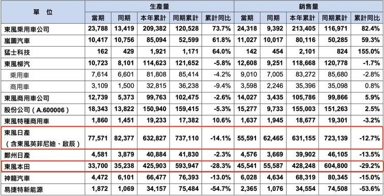 在東風汽車集團的銷量構成中,東風日產和東風本田分別銷售63.1萬輛和42.8萬輛。