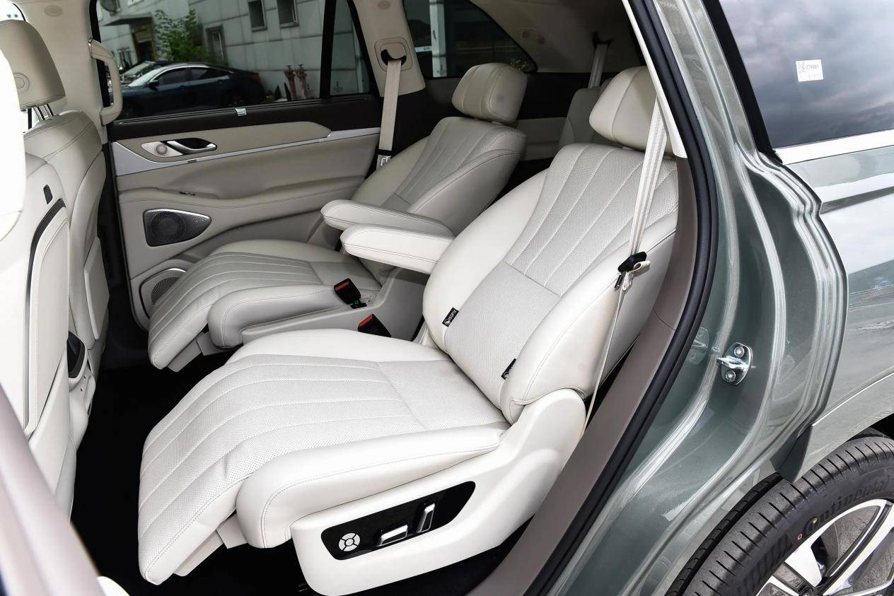 尺寸不小,藍(lán)山比理想L8還要略大一些,其長寬高分別為5156*1980*1805毫米,軸距3050毫米,比理想L8長45毫米,車內(nèi)空間比較寬裕,同級(jí)別中,藍(lán)山的乘坐空間其實(shí)沒什么好擔(dān)心的,即便是第三排的座椅高度也不低,填充比較厚實(shí),還標(biāo)配加熱,乘坐175厘米以下的人員還是比較舒適的,前兩排就更不用擔(dān)心了,實(shí)車體驗(yàn),身高180厘米乘員前兩排都還有1拳多的頭部空間余量,二排座椅調(diào)至最后,腿部空間非常寬裕,可以把腿托打開,呈仰躺姿勢。