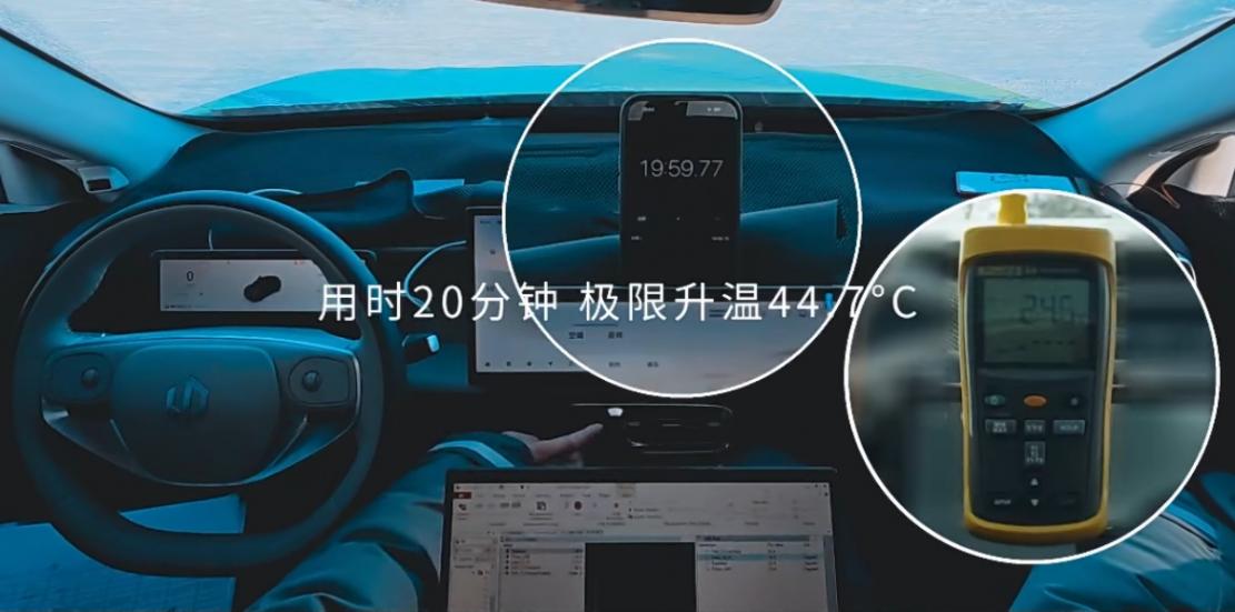 首先是空調測試,車輛放置戶外靜置12小時,室外-24度、車內-20.1度環(huán)境下,空調調節(jié)最高溫度、Auto檔,20分鐘極限升溫達44.6度。敲一下黑板,這是極限溫度,事實上,車內氣溫在十八九度就很舒適了,兩三分鐘就能達到,你可以采用遠程控制提前打開,進入車內就可以立刻享受到溫暖的體驗。值得一提的是,零跑的熱管理系統(tǒng)是完全不輸特斯拉的,做到27合1高度集成,將車輛各部件熱量利用到非常好的表現,零下30度還能高效工作。