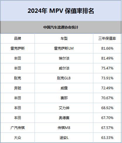 對于很多家庭來說,保值率是他們十分看重的指標,參考中國汽車流通協(xié)會的統(tǒng)計,有購買MPV需求的家庭不妨了解一下2024年主流燃油MPV的三年保值率情況。
