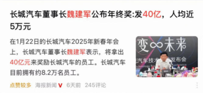 另外,長城的魏總更是非常大氣,在裁員、降薪、倒閉的行業(yè)大背景下,直接拿出了40億,給大家發(fā)年終獎。
