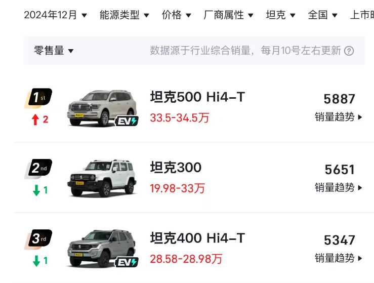 不過,2024年長城利潤大漲更應(yīng)該歸功于坦克400 Hi4-T、和坦克500 Hi4-T。這兩款車以30萬級的售價,12月份合計銷量超過1萬輛。