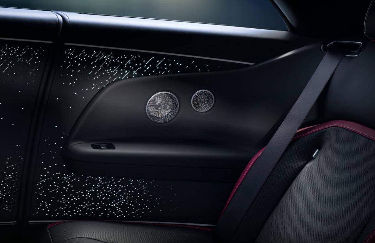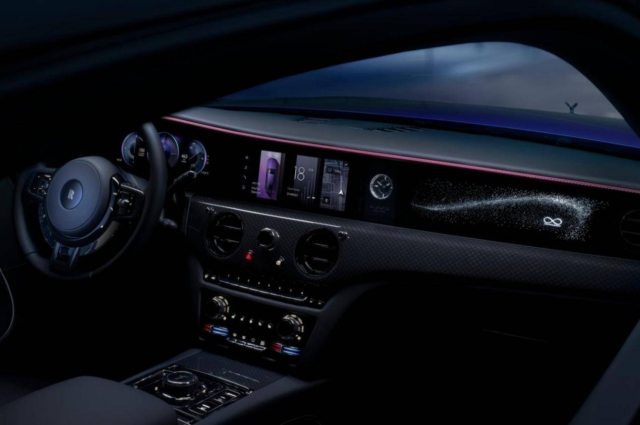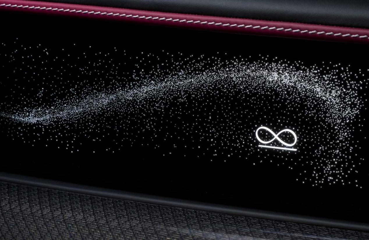 從進入Black Badge車型的那一刻,就可以發現與眾不同之處,相較于內斂的標準車型,BB版本更張揚大膽,主駕數字儀表采用彩虹一般的底色,副駕前方的飾板上有一個特殊圖案沒,這是對勞斯勞斯歡慶女神的抽象表達,融入BB車型專屬的無限符號。該標志象征無限力量。整個圖案由5500多顆不同尺寸,不同亮度的“星星”組成,鑲嵌在鋼琴黑色的“夜空”中。
