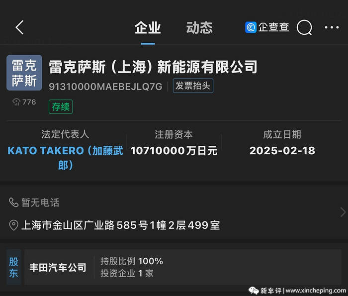 近日,我們從相關渠道處查詢到,雷克薩斯(上海)新能源有限公司正式成立,法定代表人為KATO TAKERO,注冊資本1071億日元(約合人民幣51.68億元)。該公司由豐田汽車公司全資持股,經營范圍涉及汽車零部件研發、電機及其控制系統研發、汽車銷售、新能源汽車整車銷售等。