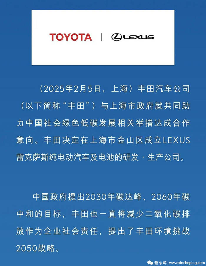 在今年2月初的時候,雷克薩斯官方就曾發布通過,表示其將在上海獨資成立一家純電動汽車及電池公司,用于研發雷克薩斯品牌純電動車型,計劃2027年正式投產。