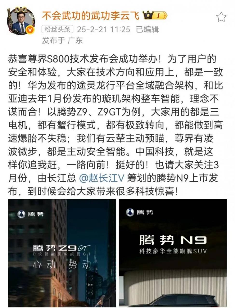 就在尊界技術(shù)發(fā)布會(huì)次日(2月21日),比亞迪高管李云飛在社交媒體上喊話尊界,可以看作是對(duì)余承東此前喊話比亞迪“全民智駕”的一種回應(yīng)。