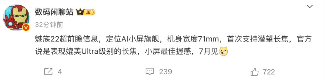 近期的時候有爆料稱,魅族22定位AI小屏旗艦,而且機身寬度為71mm!和小米15差不多,整機握感自然也還不錯,還給到了一顆潛望式長焦,官方更是號稱其表現媲美Ultra級別的長焦。