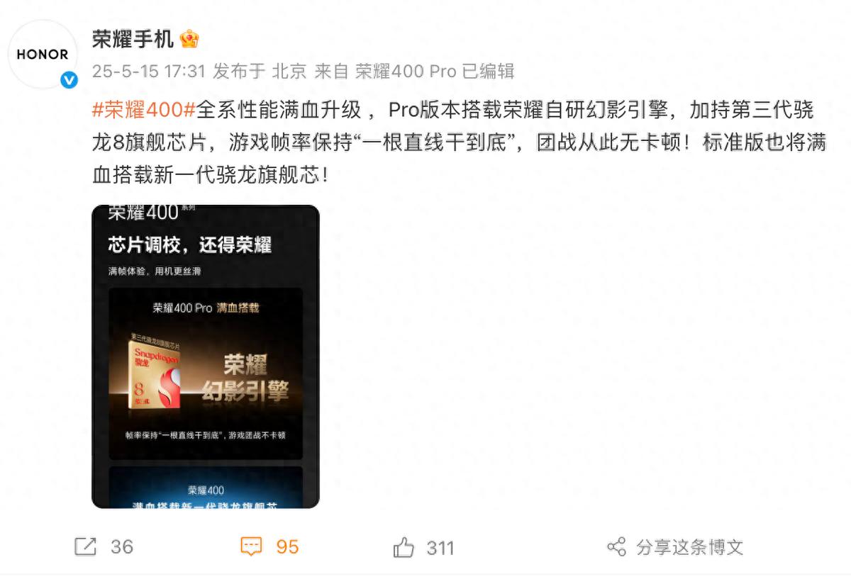 榮耀400 Pro搭載定制滿血版驍龍8 Gen3也是實力的進一步佐證。事實上,這顆處理器仍是目前安卓陣營的第一梯隊表現。而滿血版將擁有高達3.3GHz的主頻,實力相當強大。