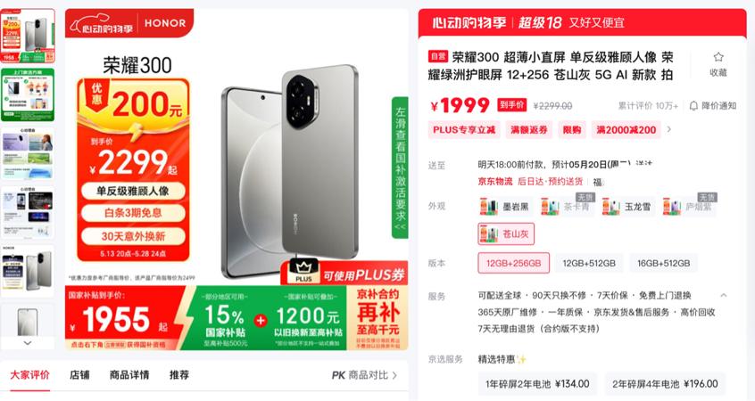 根據(jù)榮耀京東自營旗艦店最新消息顯示,榮耀300標(biāo)準(zhǔn)版12+256GB版本目前直降200元,疊加國補(bǔ)活動后最低到手1955元;榮耀300 Pro標(biāo)配12+256GB版本目前直降300元,疊加國補(bǔ)活動后最低到手2635元。