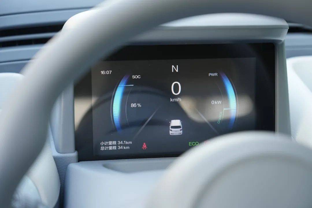 座椅也采用了撞色搭配,支撐性和包裹性還不錯,面前是7英寸全液晶儀表,提供的信息有限,但是布局邏輯很清晰,包括車速、電量、續航里程等。低頭竟然還有彩蛋,電門踏板采用游戲中的“加速”符號,剎車踏板采用“暫停”符號設計,不知道會不會有駕駛員因此獲得更多快樂的駕駛情緒。