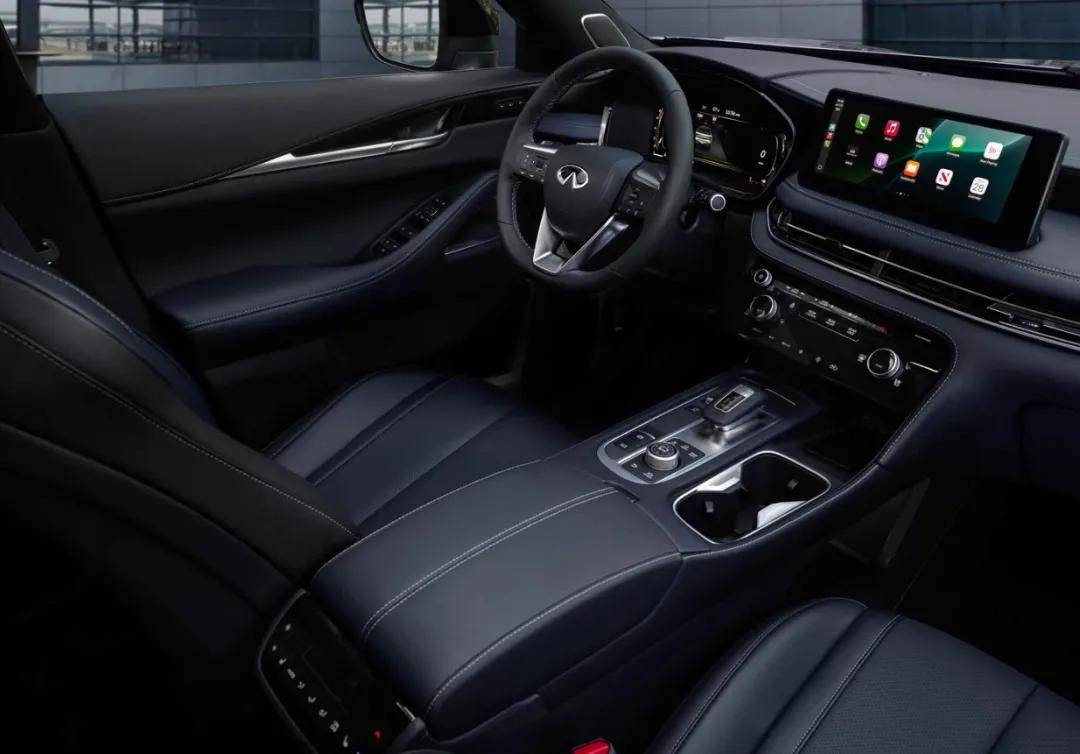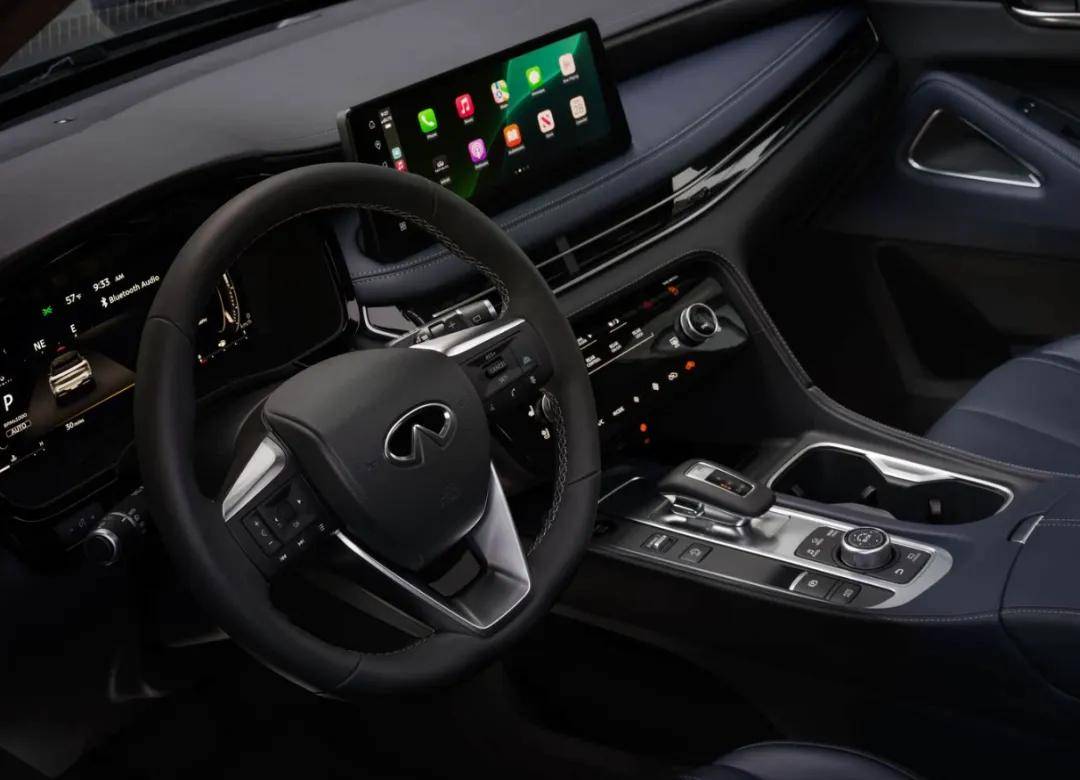 2026款QX60全系搭載2.0T VC-Turbo可變壓縮比渦輪增壓發動機,最大功率252馬力,峰值扭矩380N·m,匹配9速手自一體變速箱,提供前驅與智能四驅兩種驅動形式。這套動力系統通過可變壓縮比技術(8:1至14:1)實現了動力與燃油經濟性的平衡,WLTC綜合油耗降至9.1L/100km(兩驅版)。智能四驅系統可實現前后軸50:50扭矩分配,濕滑路面循跡性顯著提升,但越野性能仍以應對日常輕度非鋪裝路面為主。
