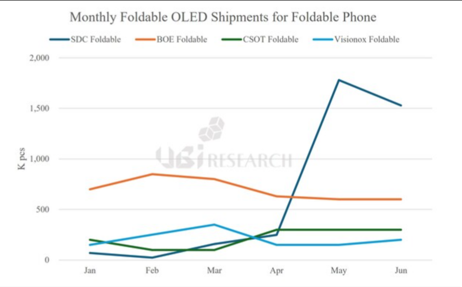 據市場調研公司UBI Research近日的數據顯示,三星顯示占據第二季度折疊屏手機OLED出貨量的52%,位居第一。