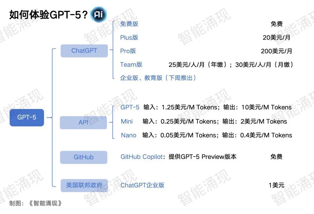 根據《智能涌現》的統計,就GPT系列語言模型而言,GPT-3.5到GPT-4,價格有過一次躍升。但GPT-5三個模型的API價格,都比GPT-4最便宜的Preview版本(輸入:10美元/M Tokens;輸出:30美元/M Tokens)還要低。