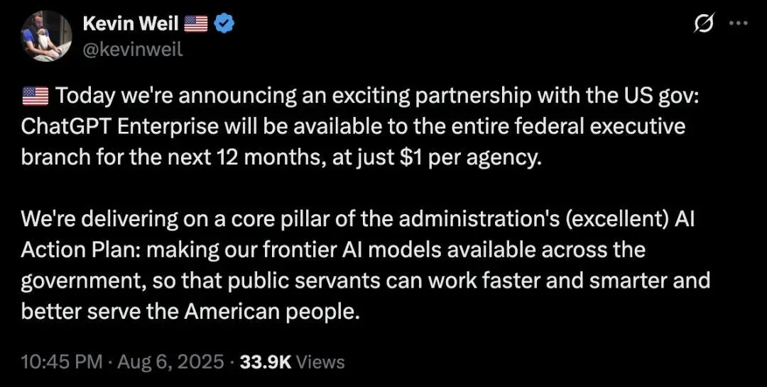 8月6日,OpenAI首席產品官Kevin Weil宣布,在未來12個月里,ChatGPT企業版將對美國聯邦政府開放,每個機構只需要支付——1美元!