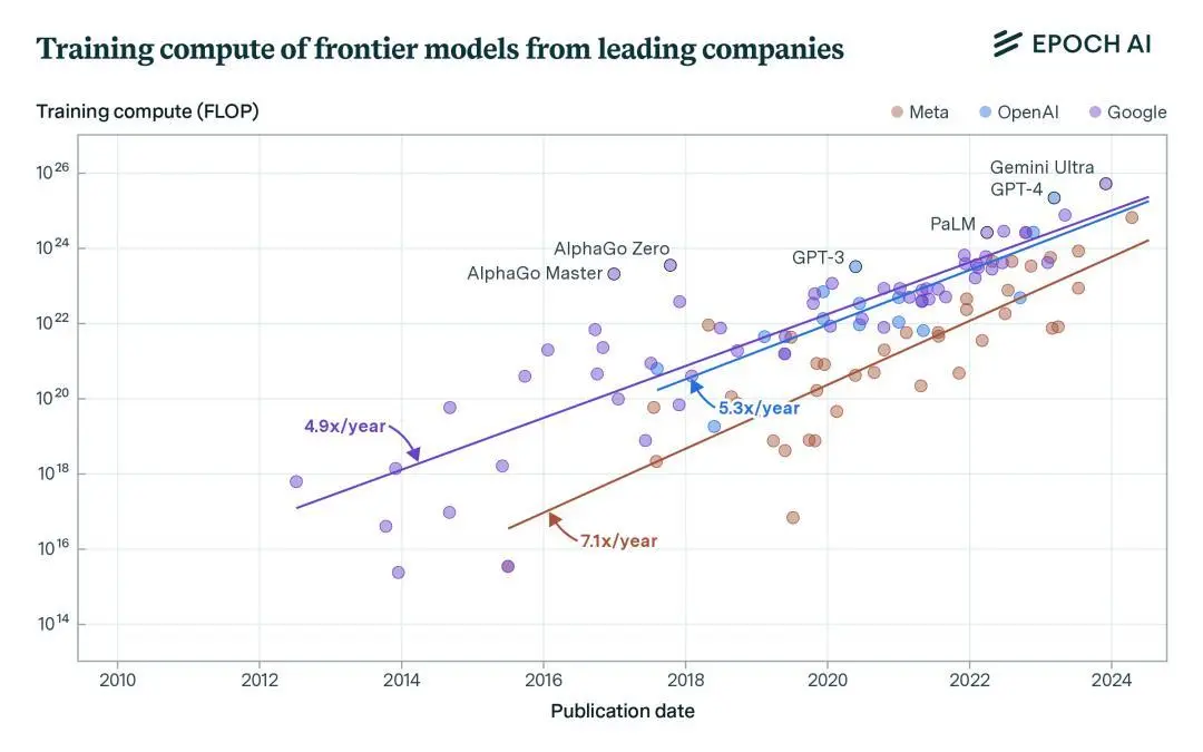 非營利AI研究組織Epoch AI的統計顯示,OpenAI、Meta、Google三家公司,在頂級模型訓練上所消耗的計算量,每年仍然呈倍數遞增。比如,OpenAI模型訓練計算規模,平均每年增長到5.3倍。