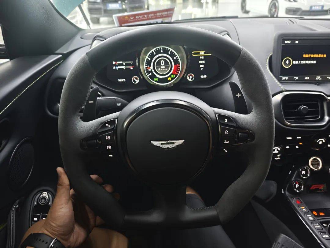 在內飾方面,Vantage F1同樣顯得十分特別。比如說在內飾的材料上,設計師采用曜石黑色皮革和幻影灰Alcantara材質包裹,既讓內飾在視覺上產生一種享受感,也讓它的內飾觸感拉到滿分。