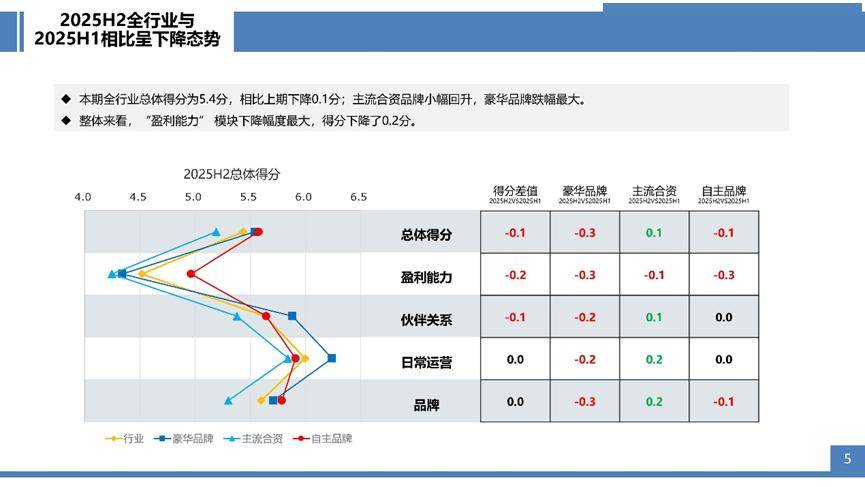 經銷商之聲2025下半年(H2)夏季版調研顯示,行業綜合得分為5.4分,自2022年下半年(H2)以來已連續7期下滑。相較2025上半年(H1),全行業得分下降0.1分,豪華品牌、自主品牌得分均有所回落,分別降低了0.3分和0.1分;主流合資品牌則實現小幅回升(0.1分)。