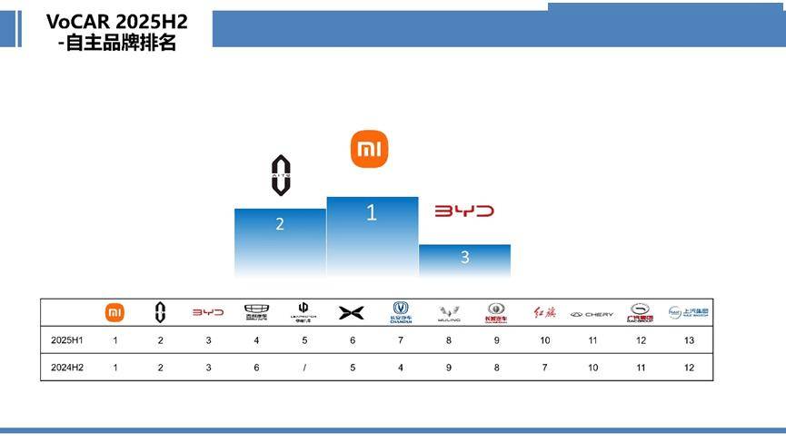 2025年,自主品牌憑借硬核產品力脫穎而出,綜合得分首次超越豪華品牌,登頂三大細分市場。小米汽車、AITO、比亞迪延續“全科優秀”表現,穩居前三;吉利連升兩級至第四;零跑品牌則以銷量突圍,首度躋身“經銷商之聲”榜單。