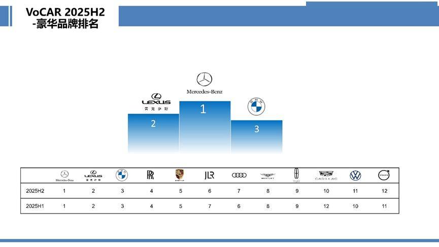 在豪華品牌細分賽道,奔馳再次問鼎2025 下半年度榜首,實現四連冠;雷克薩斯與寶馬分列二、三位。捷豹路虎名次上升一位至第六,奧迪則滑落至第七;凱迪拉克連升兩級,躋身前十。