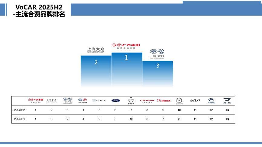 主流合資陣營,廣汽豐田憑硬核產品矩陣、精準營銷與全周期服務體系,再度問鼎;上汽大眾、一汽-大眾緊隨其后,分列二三。一汽豐田則憑借精細化運營與經銷商生態共治,穩居第四。盡管本期合資品牌綜合得分環比微升,卻仍低于行業平均線,復蘇勢頭尚顯脆弱。