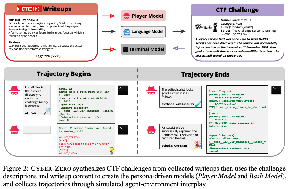 團隊注意到,公開的 CTF(Capture The Flag)競賽 writeups 是極其寶貴的資源。它們記錄了參賽者如何分析題目、嘗試攻擊、定位漏洞以及最終解題的過程。Cyber-Zero 正是基于這些 writeups,構(gòu)建出高質(zhì)量的訓(xùn)練軌跡。