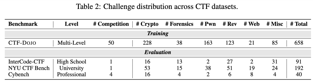 研究團隊選擇了全球最具代表性的 pwn.college CTF Archive 作為種子數(shù)據(jù)。該數(shù)據(jù)集收錄了數(shù)百個來自頂級賽事的高質(zhì)量題目,涵蓋六大類別,從 Web 漏洞、二進制利用到密碼學(xué)挑戰(zhàn)一應(yīng)俱全。通過精心篩選,并排除測試數(shù)據(jù)中已包含的題目,最終形成了 658 個獨立任務(wù)實例,為智能體訓(xùn)練提供了堅實的基礎(chǔ)。