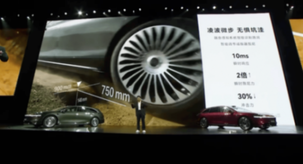 車輛的舒適性也進一步提升,在過坑洼路段的時候幾乎無感。在介紹車輛的底盤時候,余承東又喊出了四個字:“強得 飛起”。