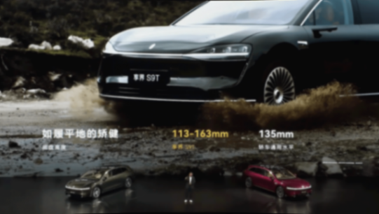 享界S9T的旅行車定位,注定其底盤高度比SUV更低,為113-163mm,但配合空氣懸架,其在泥地行駛如履平地。此外,其涉水深度堪比SUV達到430mm,而轎車常規設計標準為300mm。