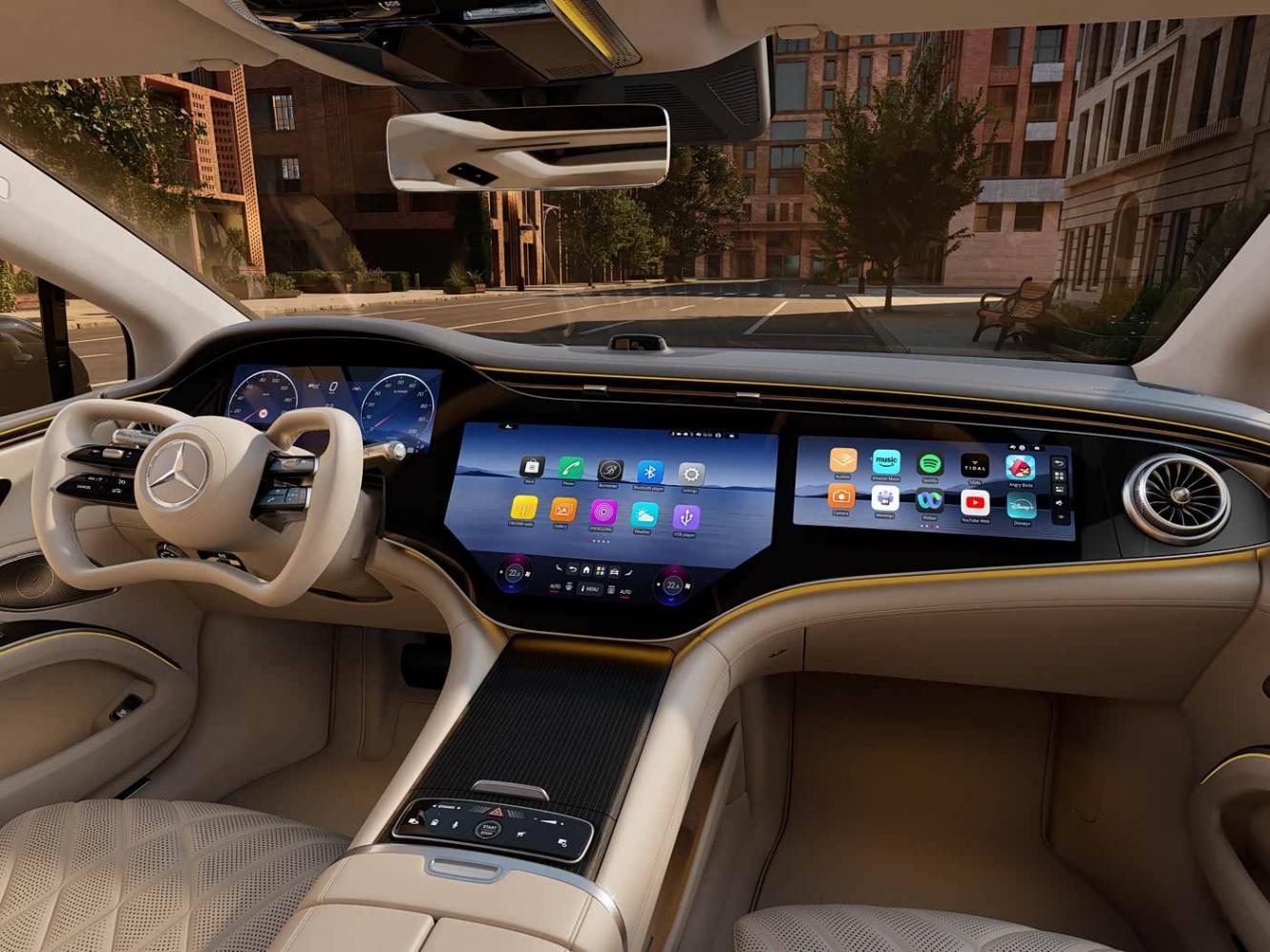 要說(shuō)奔馳最有賣點(diǎn)的地方,那肯定就是車內(nèi)了。新車的內(nèi)飾依舊主打科技風(fēng),而且辨識(shí)度很高,一看就知道這是一臺(tái)奔馳。具體來(lái)看,整個(gè)內(nèi)飾幾乎都是屏幕,為55英寸三聯(lián)屏,車機(jī)UI也有調(diào)整,會(huì)搭載最新的MB.OS車載系統(tǒng)。雖然中間有黑邊,但整體科技感不錯(cuò)。
