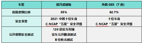 傳祺GS8采用五環(huán)籠狀框架打造,雖然也擁有“十佳車身”的稱號,但整車高強度鋼使用比例為62.7%,在安全用料上與攬月存在客觀差距,被動安全表現(xiàn)更為常規(guī),同時無公開極限安全測試,相較之下,攬月超越版擁有更令人信服的安全實力。