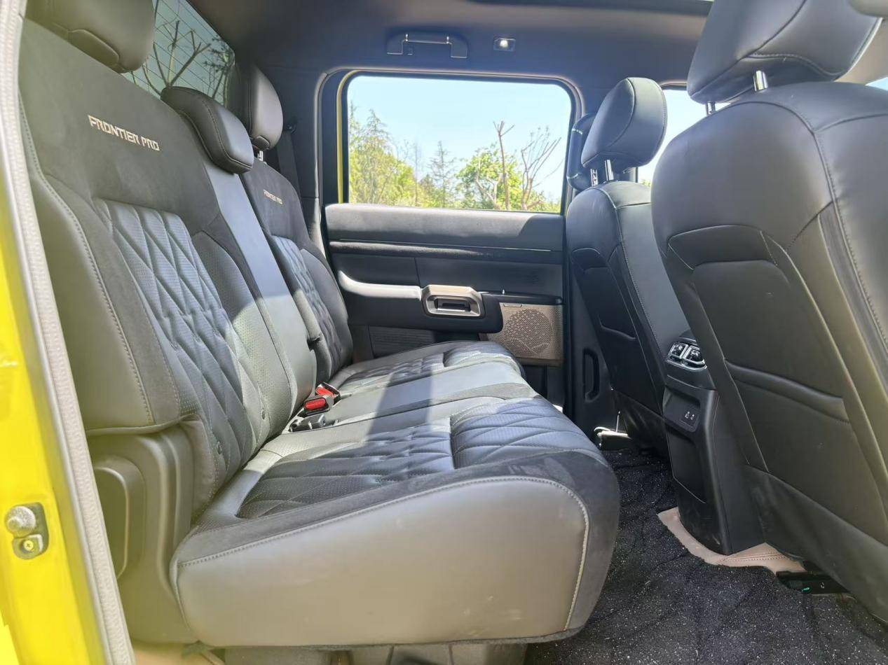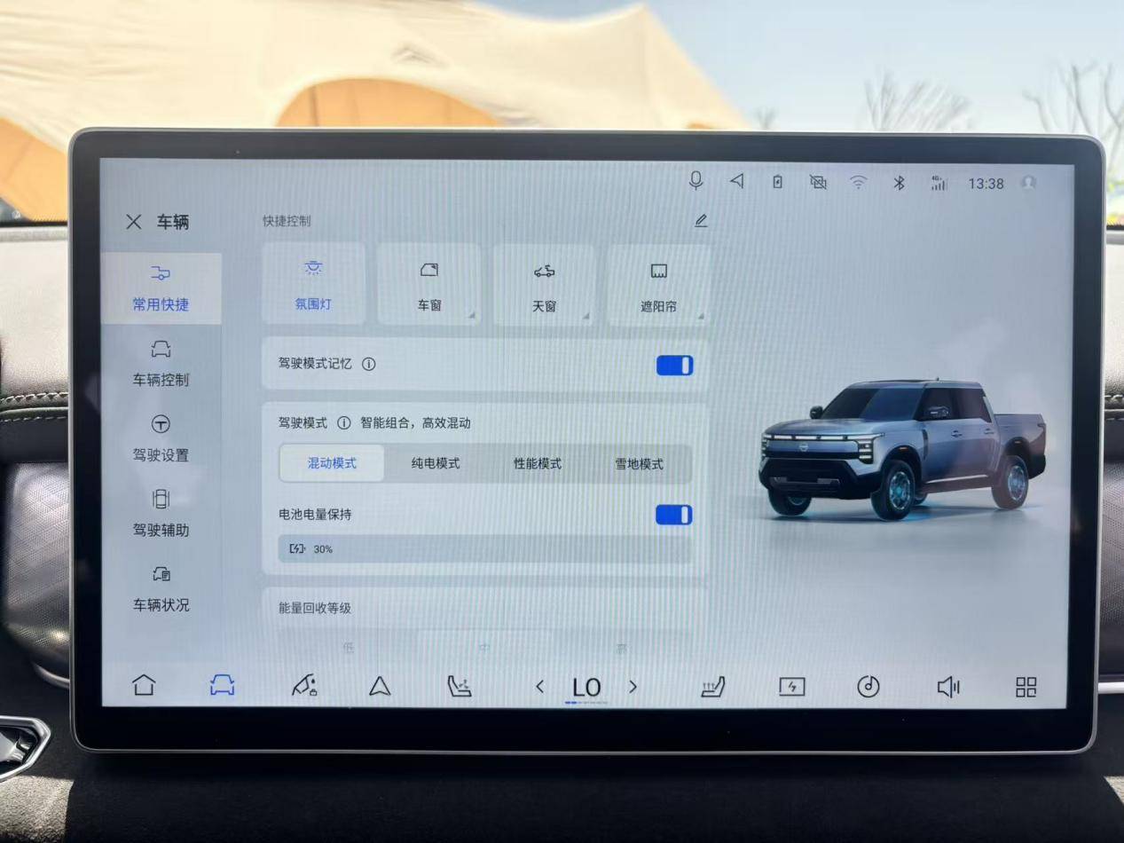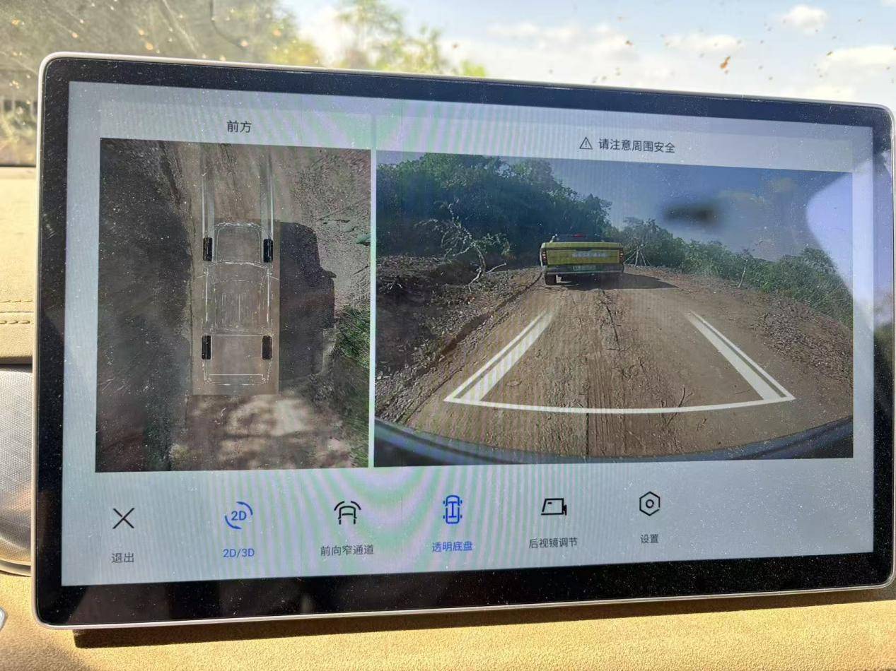 坐進車內,純平地板設計和90°的超大開門角度,徹底告別了傳統皮卡的局促感——不管是上下車還是裝卸貨箱里的摩托車、路亞艇,都從容得很。座椅更是亮點,通風、加熱、按摩一應俱全,長途穿越也不會腰酸背痛,說是頭等艙級享受一點不夸張。中控臺上14.6寸大屏和10寸液晶儀表雙屏聯動,配合540°全景影像,科技感和安全感一步到位。