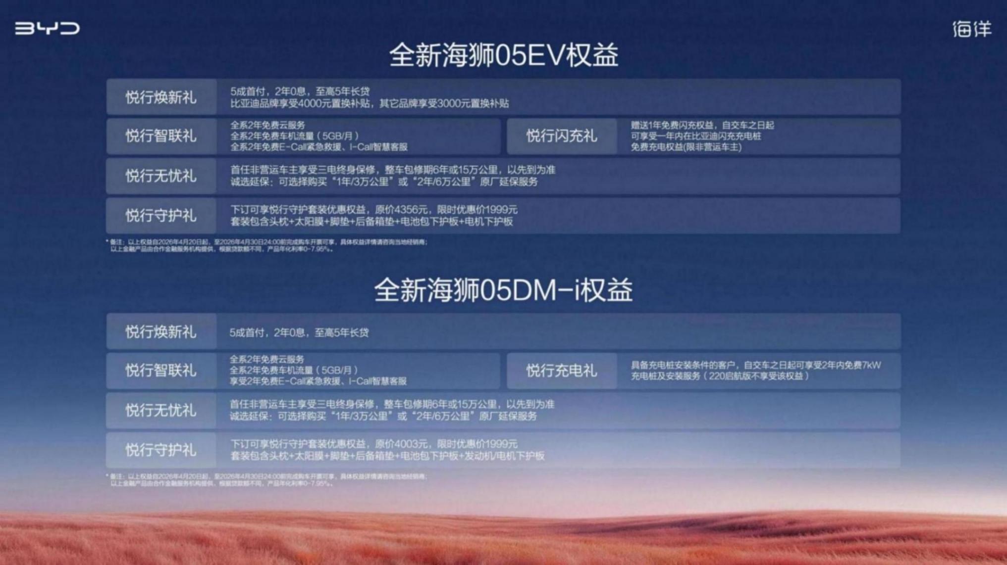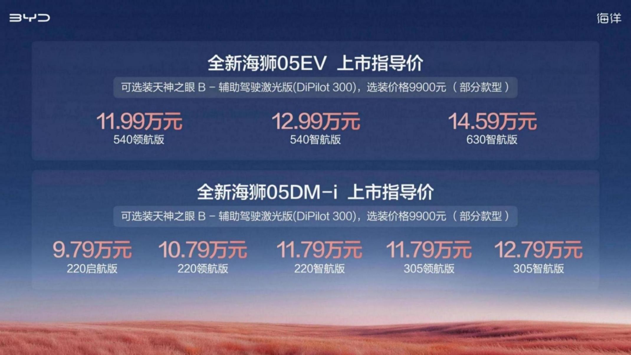 4月20日,比亞迪全新海獅05正式上市,同步推出EV純電與DM-i插混兩大版本,官方指導價9.79萬元-14.59萬元。其中DM-i版本售價9.79萬元-12.79萬元,EV版本11.99萬元-14.59萬元,覆蓋通勤、家庭、長途等全場景出行需求,憑借顏值、駕控、智能、舒享、安全五大升級,重新劃定A級SUV價值標準。
