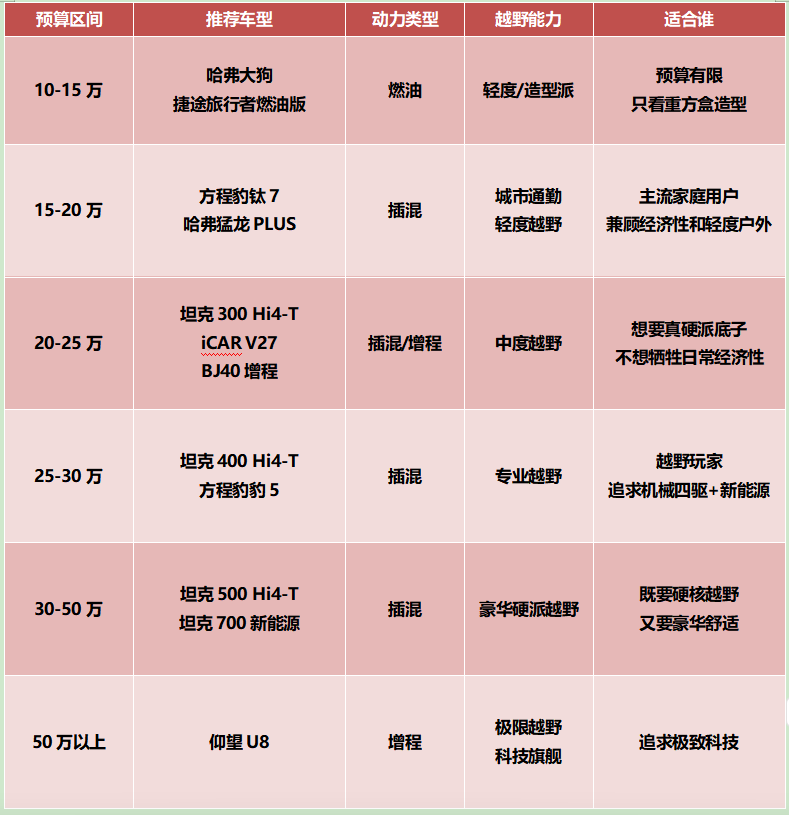 在買方盒子之前,你需要確定城市和戶外場景的比例是多少:90%城市通勤+10%周末出游,“城市仿硬派”是最佳解;50%城市+50%戶外,插混或增程的泛越野車型既能兼顧日常經濟性,又具備一定的脫困能力;經常戶外越野的,“真硬派”插混是首選,既保留了機械四驅的可靠性,同時還能用電機改善油耗。