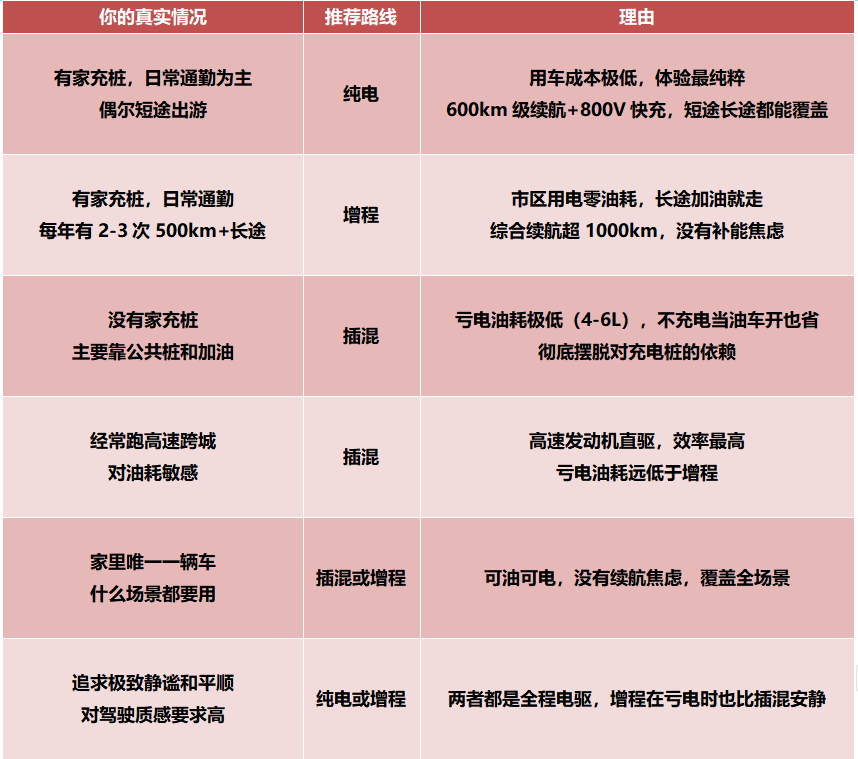 純電、插混、增程怎么選,為了方便大家理解,我們做了張表: