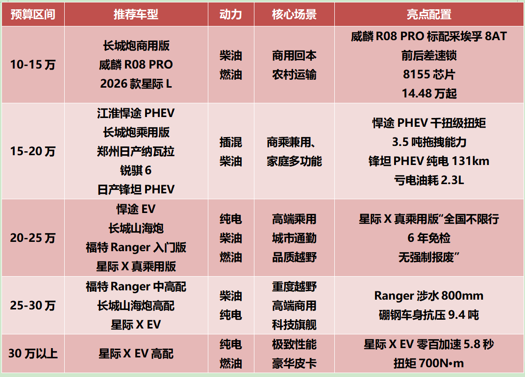 選皮卡,先要確定你主要用來干什么:純商用?商乘兼用?純家用?還是越野?按場景選車不按參數選車,在皮卡領域尤其重要。另外還得看你所在城市的皮卡政策夠不夠友好,如果全面解禁,燃油和新能源皮卡隨意選,主要看需求,如果部分限行,新能源皮卡路權更有優勢,如果仍有嚴格限制,必要時只能考慮以“6字頭”乘用車身份注冊的皮卡車型。