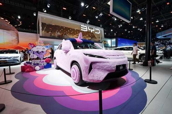 除產品自身硬核外,第三代元PLUS攜手全球知名IP小馬寶莉,開啟勇氣冒險之旅。小馬寶莉蘊含的友誼、陪伴等情感內核,和元PLUS代表的年輕態度契合。本次車展,以“紫悅”形象打造的“元氣痛車”同步展出,成為熱門打卡點。