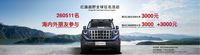 去年,共有260511位海內外朋友熱情參與了紅旗品牌發起的紅旗越野“全球征名活動”,為了感謝眾多海內外朋友對“紅旗”的熱愛和關注,紅旗品牌將為每位參與者贈送3000元紅旗全系購車券,若購買紅旗越野,可額外再享3000元加贈!