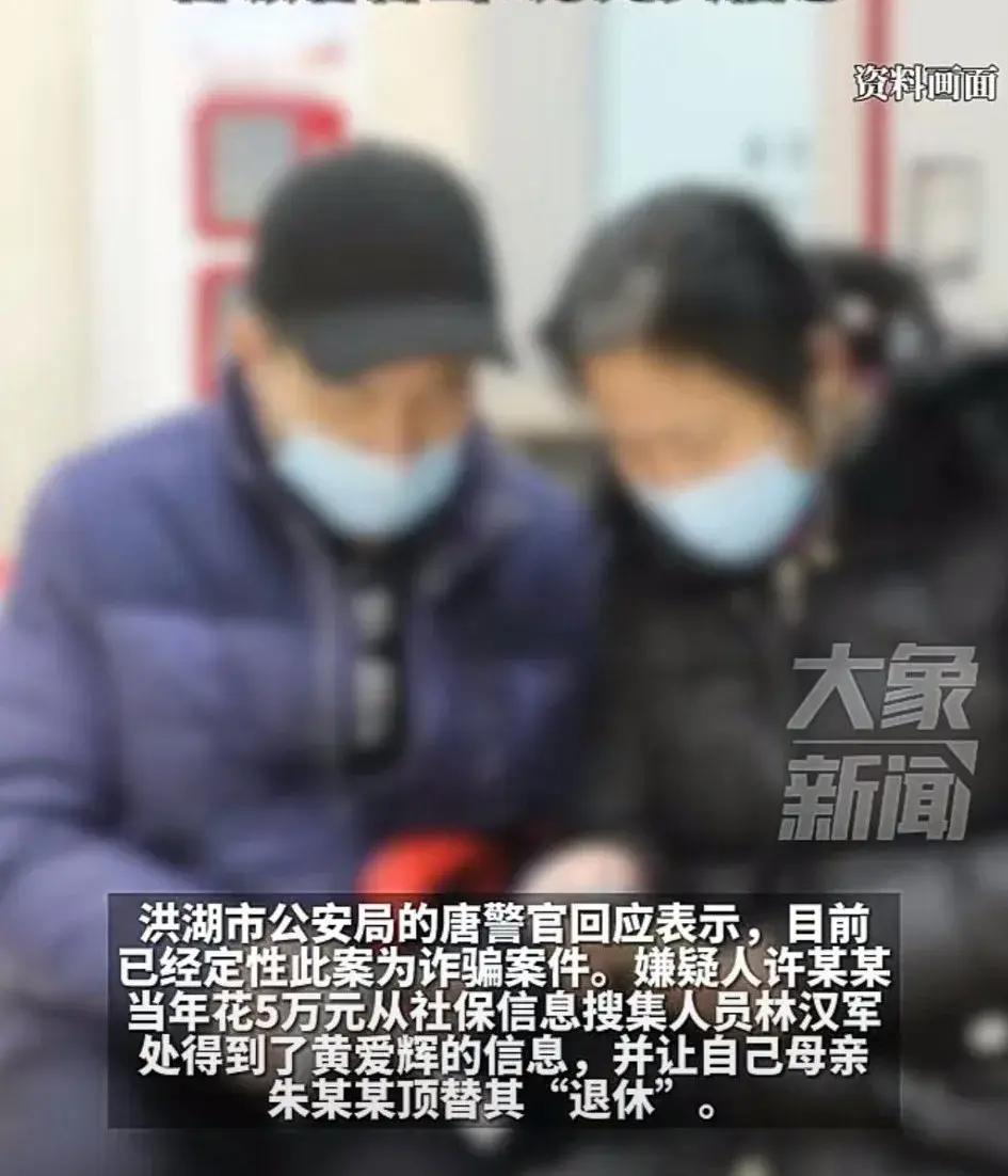 據(jù)公安部門調(diào)查,是一個(gè)姓許的,花5萬元從社保信息收集員處得到黃女士信息,并讓自己的母親朱某某頂替其“退休”。