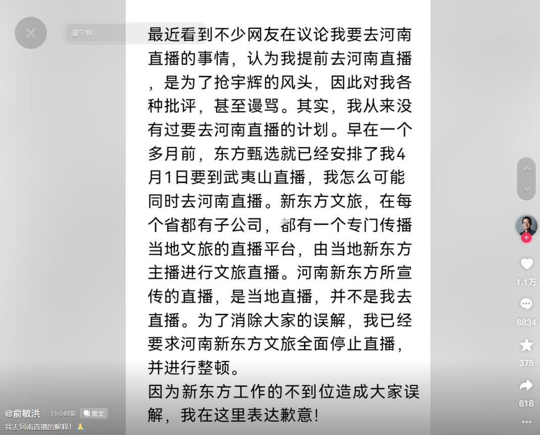 他指出,新東方文旅在每個省都有子公司,都有一個專門傳播當地文旅的直播平臺,由當地新東方主播進行文旅直播。“河南新東方所宣傳的直播,是當地直播,并不是我去直播。為消除大家的誤解,我已經要求河南新東方文旅全面停止直播,并進行整頓”。