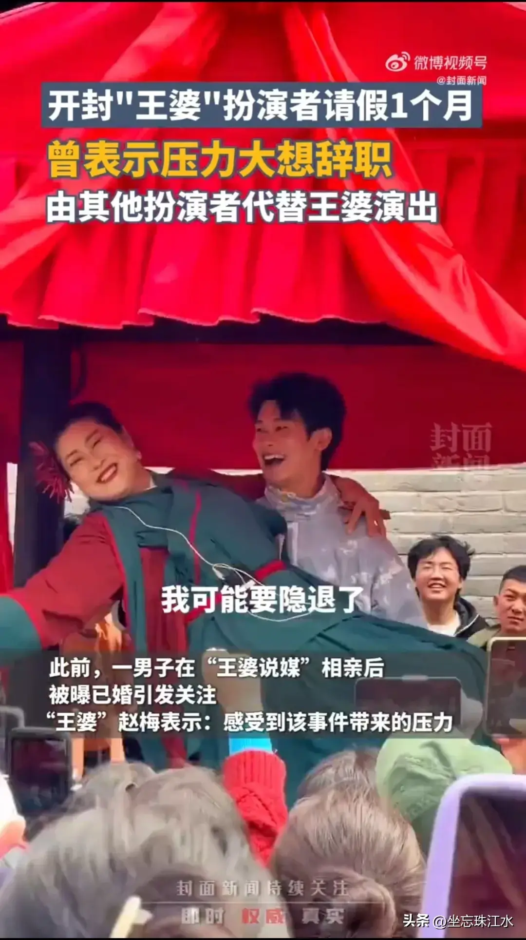 近日,開封市萬壽山景區王婆相親,爆火全網,甚至央視也加入點評,要讓相親有自己的支持空間。持續不斷的網絡熱度,加上疑似受到結婚男相親事件影響,“王婆”扮演者趙梅深受困擾。今日,景區宣布趙梅因健康原因請假一個月,請假期間由李莉等其他扮演者代班。“王婆”換人,也引發了網友對網紅式相親的思考。過多的網紅來蹭熱度,讓這種相親方式能否存續,加上了大大的問號!